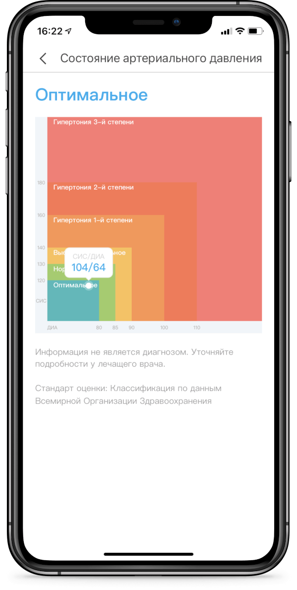 В приложении доступна подробная информация о давлении и пульсе, а также оценка измерений по шкале ВОЗ